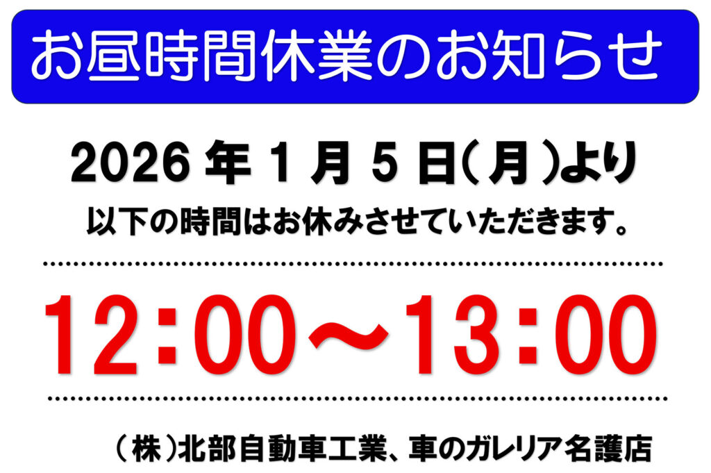 誠に勝手ながら弊社(北部自動車工業、車のガレリア)のお昼時間帯の休業につきまして、